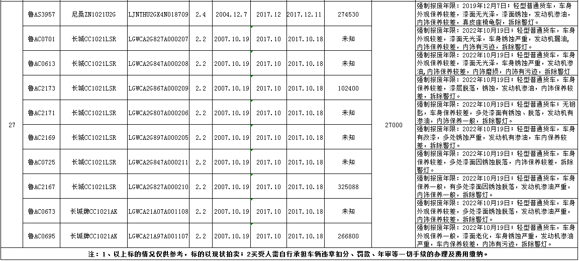 意向競(jìng)買者請(qǐng)于2017年8月27日16:00之前將拍賣保證金10000元/輛交至以下賬戶(戶名:金諾國(guó)際拍賣有限公司,開戶行:齊魯銀行濟(jì)南歷城支行,賬號(hào):000000726003800003937),準(zhǔn)備有效身份證明(個(gè)人:身份證原件及復(fù)印件;法人:營(yíng)業(yè)執(zhí)照復(fù)印件)聯(lián)系本公司辦理競(jìng)買登記。