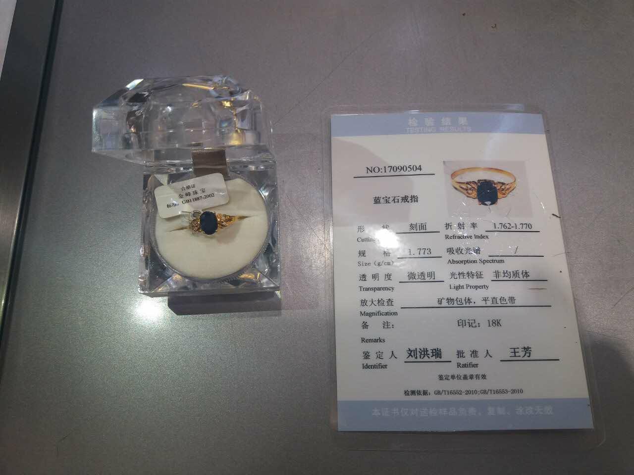 4、藍(lán)寶石戒指一枚,18K黃金鑲嵌,規(guī)格1.773g/cm。有省地礦出具檢驗報告。參考價500元。