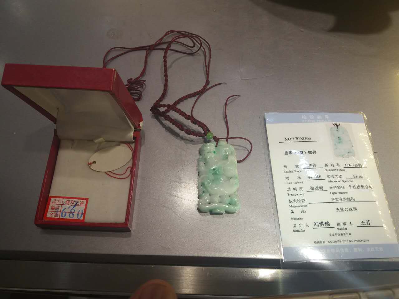 3、翡翠A貨掛件一件,規(guī)格44.968g/cm,有省地礦出具的檢驗報告。參考價1500元。