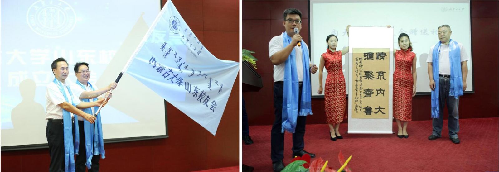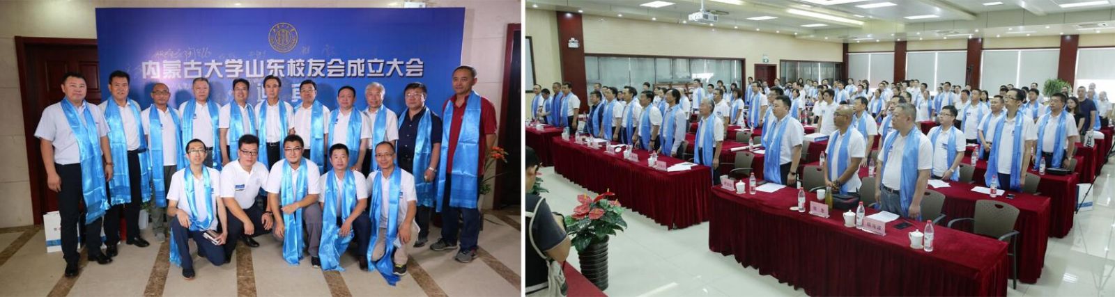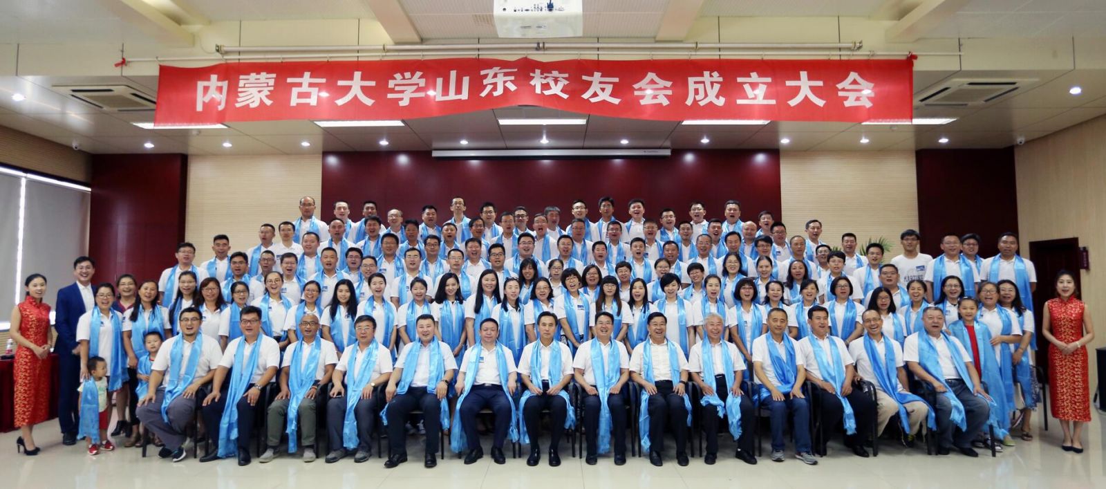上午10點(diǎn),大會(huì)在內(nèi)蒙古大學(xué)校歌中正式拉開帷幕。校友們集體觀看內(nèi)蒙古大學(xué)紀(jì)錄片;內(nèi)大90級(jí)歷史系校友、內(nèi)大山東校友會(huì)籌委會(huì)主任鄧剛作籌備工作報(bào)告;大會(huì)表決通過了內(nèi)蒙古大學(xué)山東校友會(huì)章程;公布了內(nèi)大山東校友會(huì)首屆理事會(huì)名單和校友會(huì)首任會(huì)長、副會(huì)長、秘書長、副秘書長的名單;內(nèi)大副校長、內(nèi)大校友總會(huì)會(huì)長鐵勇為山東校友會(huì)授旗,林擘會(huì)長代表內(nèi)大山東校友會(huì)接受會(huì)旗;內(nèi)大呼和浩特校友會(huì)會(huì)長、內(nèi)大文學(xué)與新聞傳播學(xué)院原黨總支書記王俊川代表兄弟校友會(huì)致辭;煙威校友會(huì)向山東校友會(huì)送上“情系內(nèi)大、匯聚齊魯”的書法作品;96級(jí)文史哲基地班校友王莉代表山東校友發(fā)言;內(nèi)大山東校友會(huì)首任會(huì)長林擘致辭,并帶領(lǐng)全體到會(huì)校友領(lǐng)讀內(nèi)蒙古大學(xué)山東校友會(huì)成立宣言;內(nèi)蒙古大學(xué)副校長、內(nèi)蒙古大學(xué)校友總會(huì)會(huì)長鐵勇代表學(xué)校發(fā)表重要講話,對(duì)山東校友會(huì)提出殷切希望。最后,鐵勇副校長等校領(lǐng)導(dǎo)、嘉賓和與會(huì)所有人員進(jìn)行了集體合影,內(nèi)蒙古大學(xué)山東校友會(huì)成立大會(huì)在一片溫馨和諧的氣氛中結(jié)束。