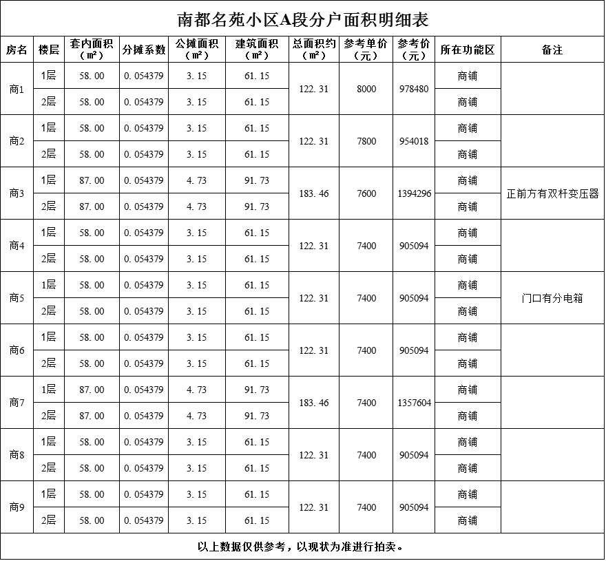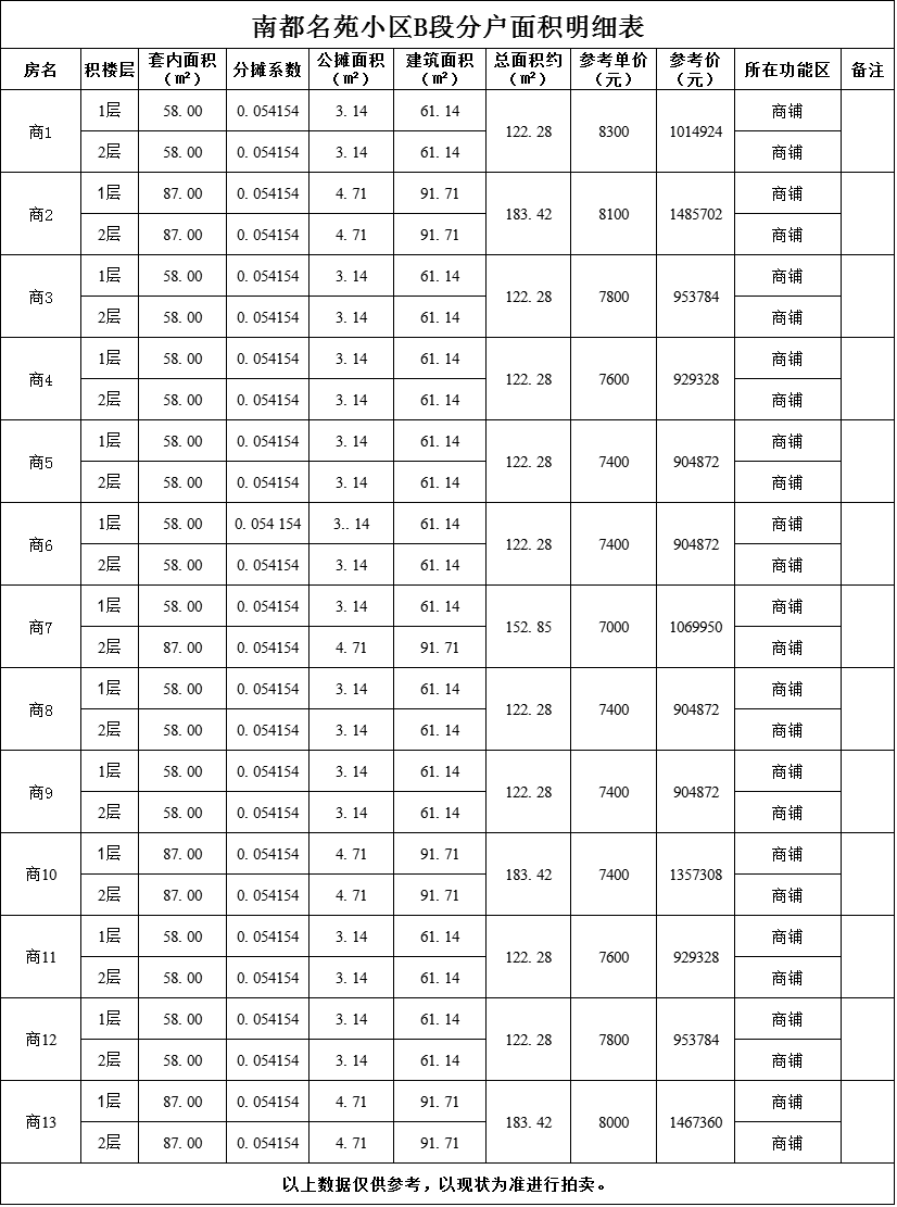 坐落于平原縣南都名苑小區(qū)沿街樓房(共29套沿街商鋪劃分為A、B、C三個(gè)區(qū)域段),合計(jì)面積約4006.26平方米,詳見(jiàn)清單。