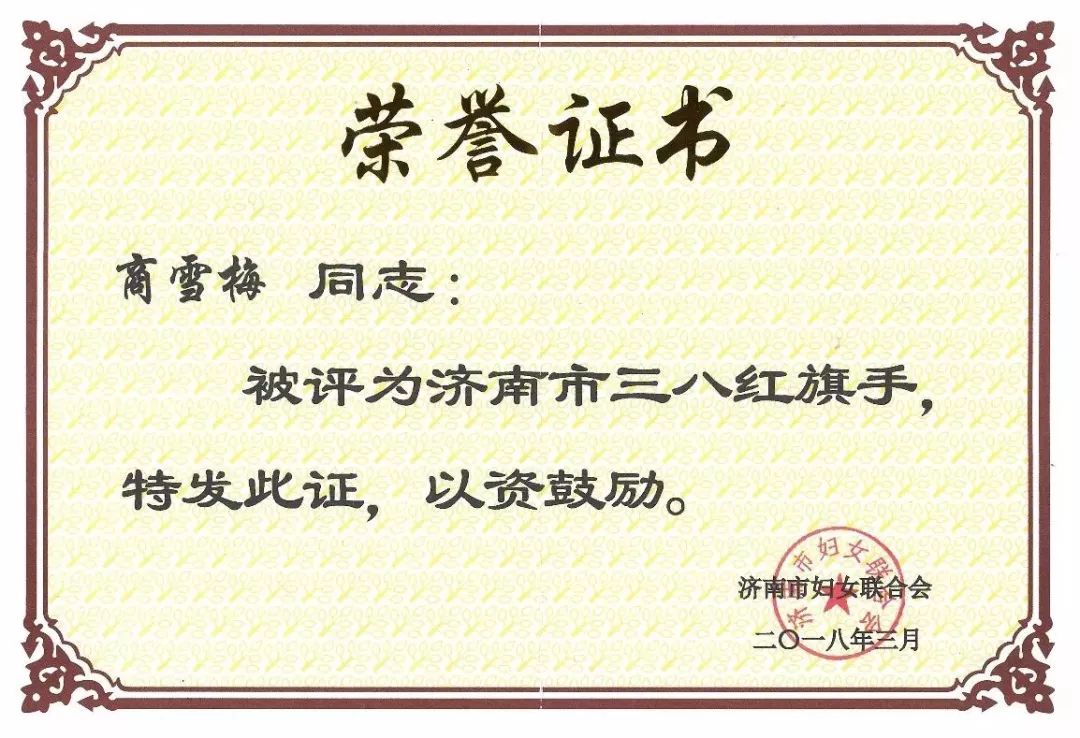 2018年3月7日上午,濟(jì)南市婦聯(lián)召開(kāi)了紀(jì)念“三八”國(guó)際婦女節(jié)108周年暨“爭(zhēng)創(chuàng)出彩人家 共建美麗鄉(xiāng)村”活動(dòng)動(dòng)員部署大會(huì)。濟(jì)南市委副書(shū)記蘇樹(shù)偉,濟(jì)南市委常委雷天太等領(lǐng)導(dǎo)出席了大會(huì)。會(huì)上,金諾國(guó)際拍賣(mài)有限公司、山東海量投資有限公司董事長(zhǎng)商雪梅同志被授予“濟(jì)南市三八紅旗手”榮譽(yù)稱號(hào)。