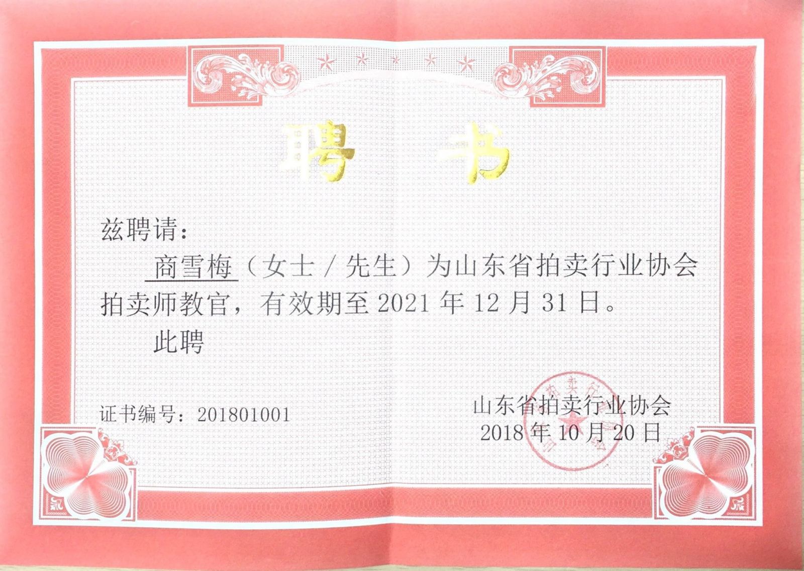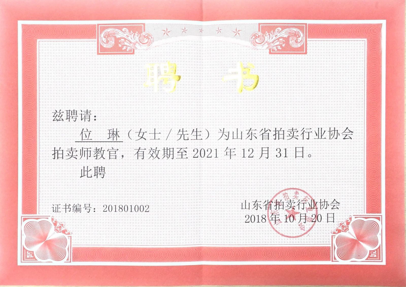 2018年10月20日,山東省拍賣師教官工作會(huì)議在泉城濟(jì)南順利召開。金諾國(guó)際拍賣有限公司董事長(zhǎng)商雪梅、總經(jīng)理位琳入選為山東省拍賣行業(yè)協(xié)會(huì)首批拍賣師教官,山東省拍賣行業(yè)協(xié)會(huì)會(huì)長(zhǎng)李偉、山東省拍賣行業(yè)協(xié)會(huì)副會(huì)長(zhǎng)、沃爾德集團(tuán)董事長(zhǎng)林擘分別向首批拍賣師教官頒發(fā)了聘書。
