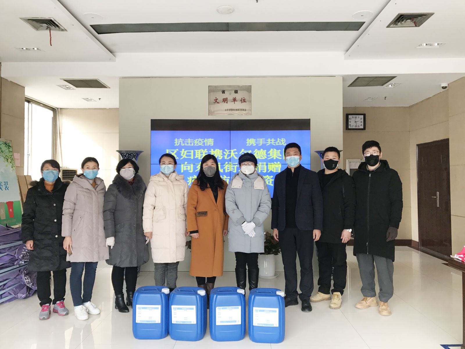 2月7日,在抗擊疫情的關鍵時刻,沃爾德集團婦聯(lián)副主席、金諾國拍總經(jīng)理位琳及集團代表,先后來到東風街道、洪家樓街道、山大路街道、全福街道、郭店街道辦事處,代表集團婦聯(lián)與歷城區(qū)婦聯(lián)一道,為基層送去消毒液防疫物資,為疫情防控保障貢獻巾幗力量。
