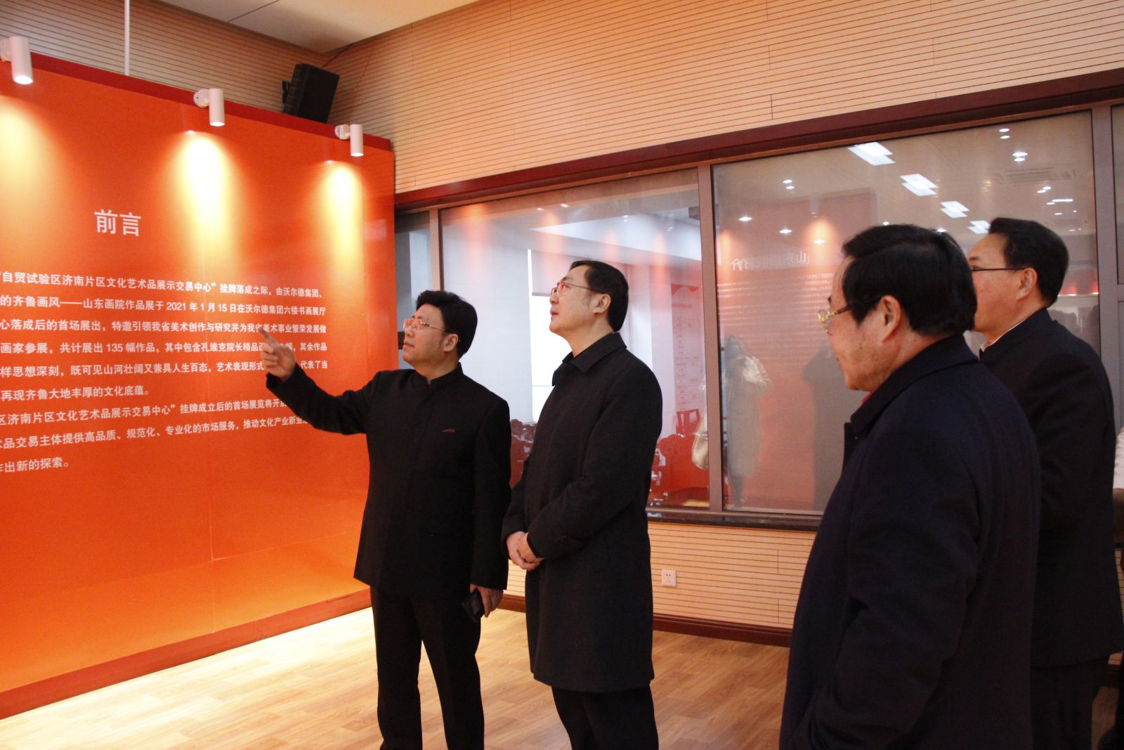 掛牌活動后,領(lǐng)導(dǎo)和嘉賓一行現(xiàn)場觀摩了展示交易中心,并認真聽取中心負責人關(guān)于中心的前期工作進展和各功能分區(qū)設(shè)置的情況介紹,重點了參觀“齊魯畫風——山東畫院作品展”。