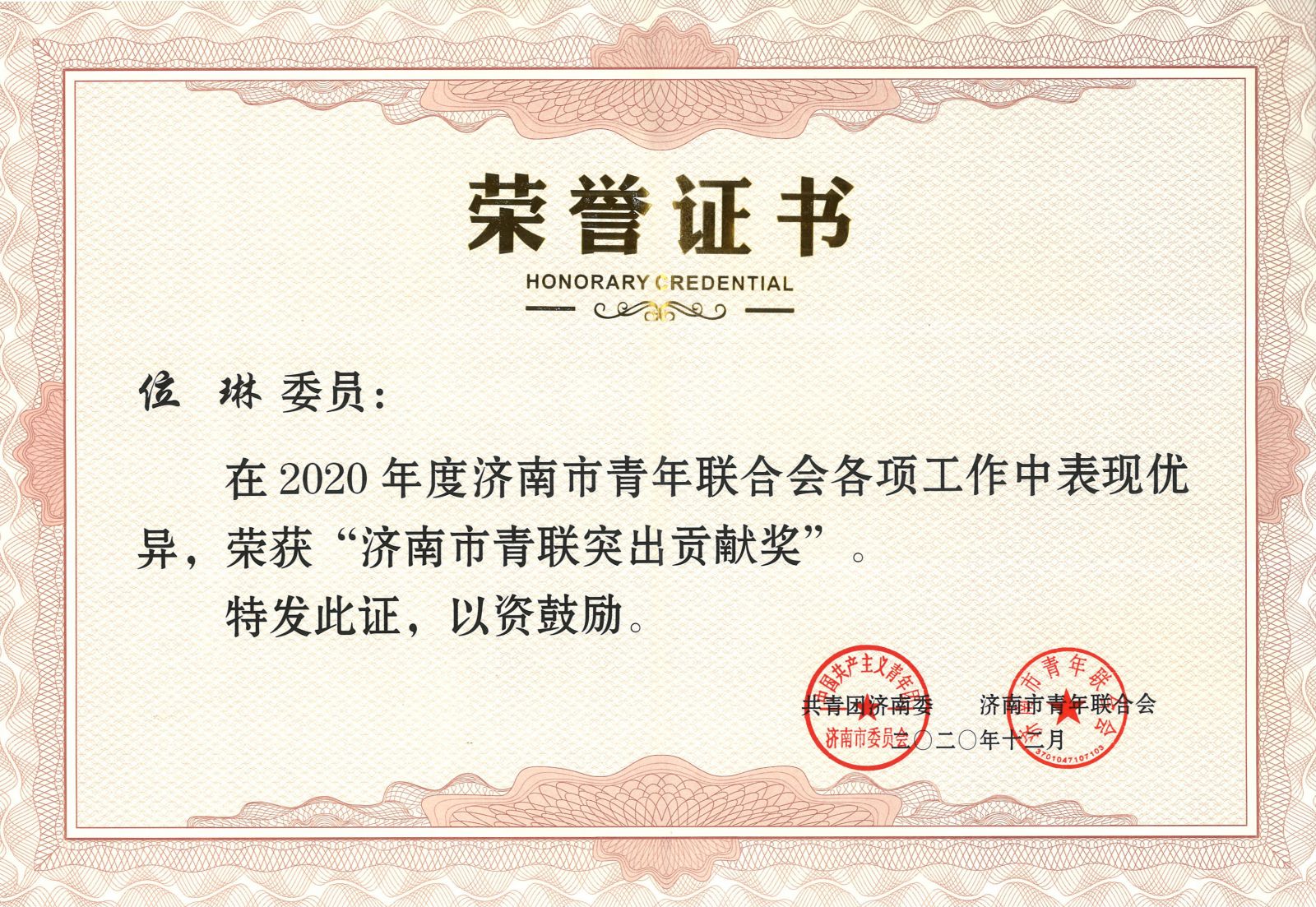 會上表揚了2020年濟南市青聯(lián)杰出成就獎、突出貢獻獎、優(yōu)秀青聯(lián)委員、青聯(lián)優(yōu)秀秘書長、青聯(lián)活躍界別組。金諾國際集團總裁位琳在2020年度濟南市青年聯(lián)合會各項工作中表現(xiàn)優(yōu)異,榮獲“濟南市青聯(lián)突出貢獻獎”。