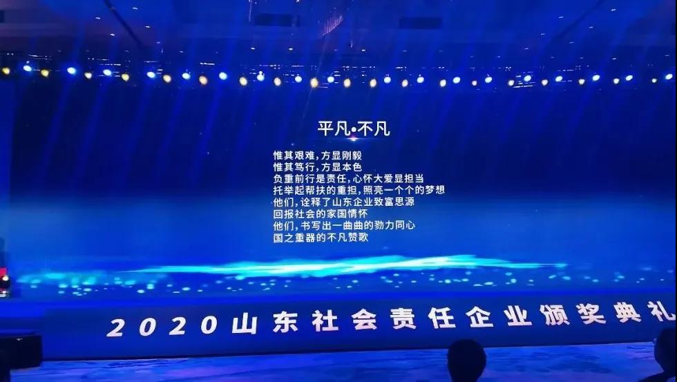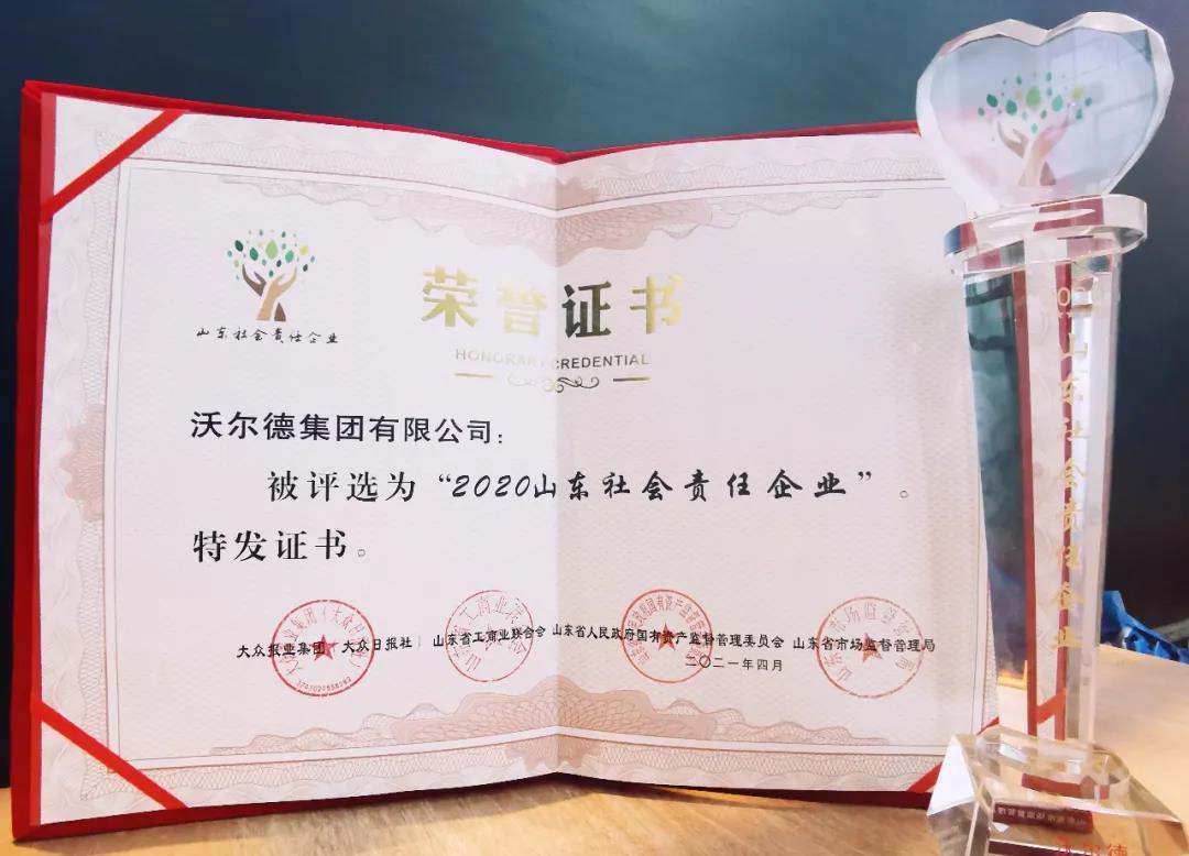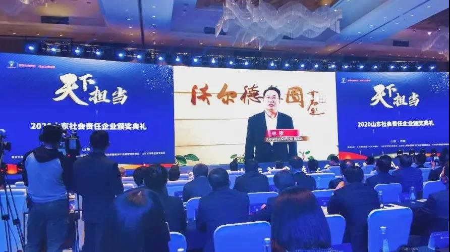 2021年4月23日下午,“天下?lián)?dāng)”2020山東社會責(zé)任企業(yè)頒獎典禮在山東濟南云鼎大廈隆重舉行。沃爾德集團榮獲“2020山東社會責(zé)任企業(yè)”稱號,董事長林擘親臨活動現(xiàn)場并接受表彰。