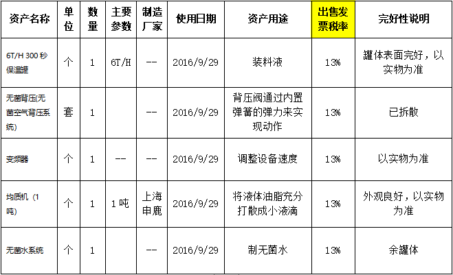 受委托,我公司將于2021年11月25日下午10時在金拍網(wǎng)平臺https://www.jinpaiwang.com.cn以網(wǎng)絡(luò)競價的方式公開處置保溫罐、變頻器、均質(zhì)機、無菌水系統(tǒng) 等一批設(shè)備,設(shè)備未裝箱,完好。