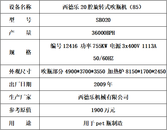 標(biāo)的一:西德樂20腔旋轉(zhuǎn)式吹瓶機(jī),起拍價 160萬元(不含稅),標(biāo)的設(shè)有保留價,競買保證金15萬元。已拆機(jī),設(shè)備完好。