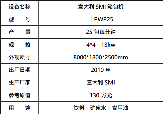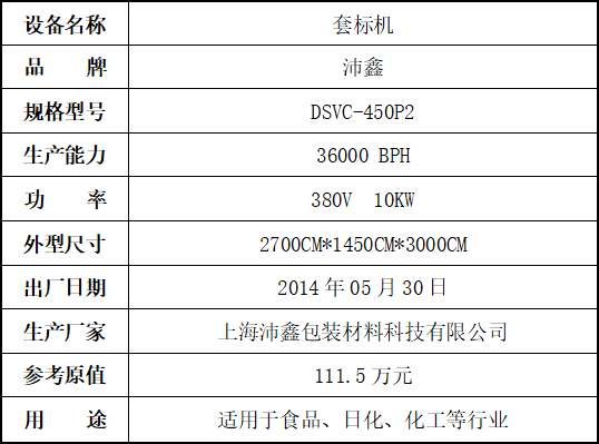 標(biāo)的四:套標(biāo)機(jī),起拍價:30萬元(不含稅),標(biāo)的設(shè)有保留價,競買保證金6萬元。已拆機(jī),設(shè)備完好。
