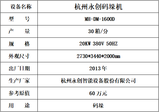 標(biāo)的六:永創(chuàng)碼垛機(jī),起拍價:15萬元(不含稅),標(biāo)的設(shè)有保留價,競買保證金3萬元。已拆機(jī),設(shè)備完好。