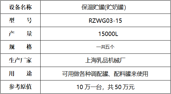 標(biāo)的七:上海乳品廠5個儲奶罐,起拍價:40萬元(不含稅),標(biāo)的設(shè)有保留價,競買保證金8萬元。已拆機(jī),設(shè)備完好。