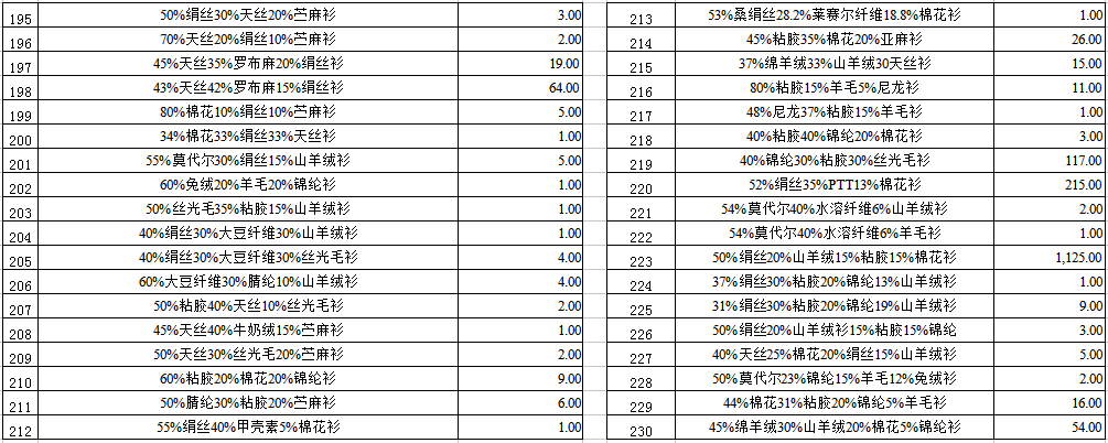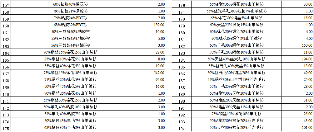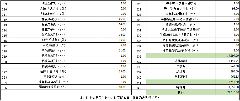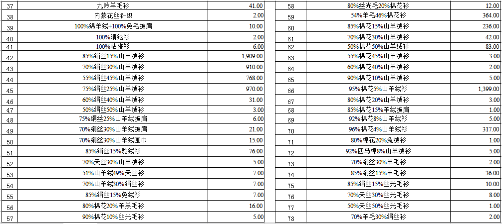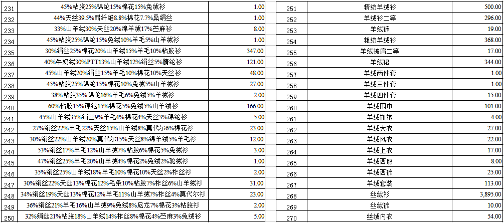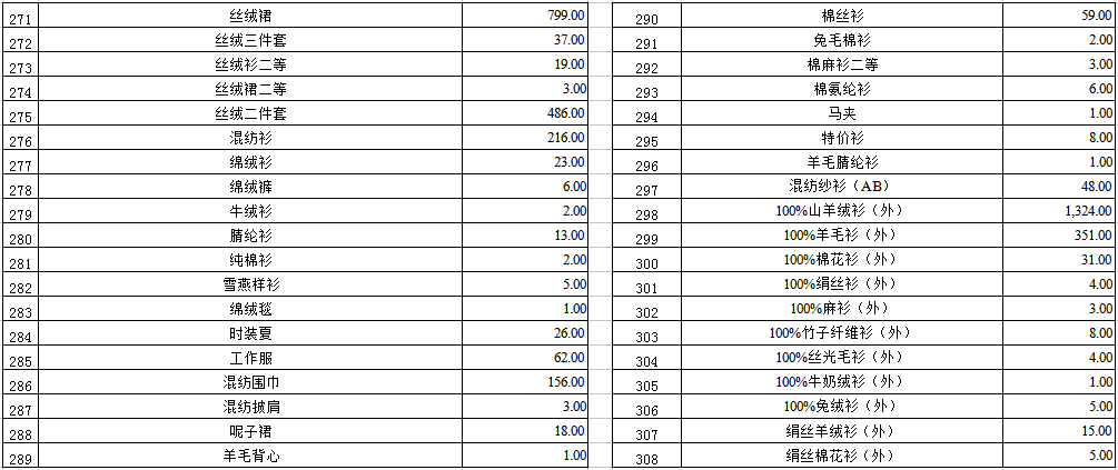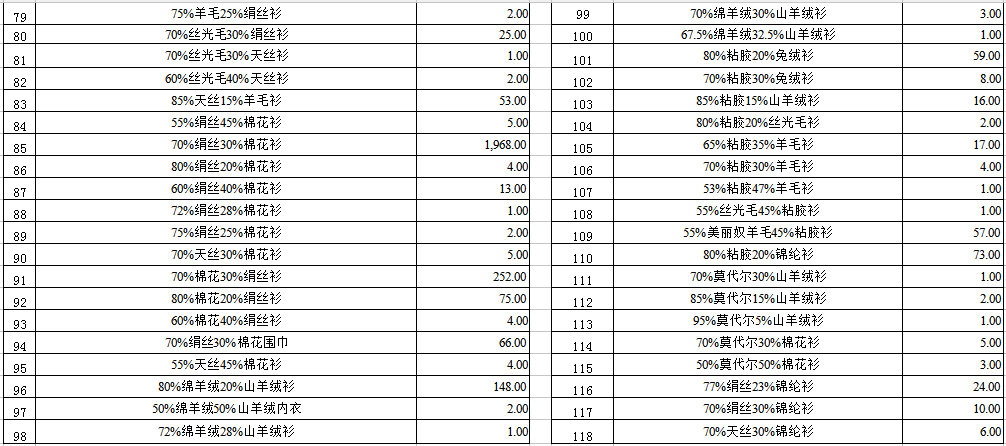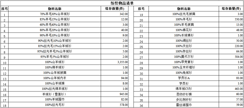 1. 紡織物品一宗(羊絨衫、莫代爾衫、棉花衫、混紡面料等)。