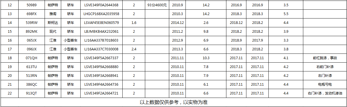公務(wù)用車一宗,品牌類型有:奔馳、邁騰、帕薩特、雅閣等共計22輛,詳見標(biāo)的清單。